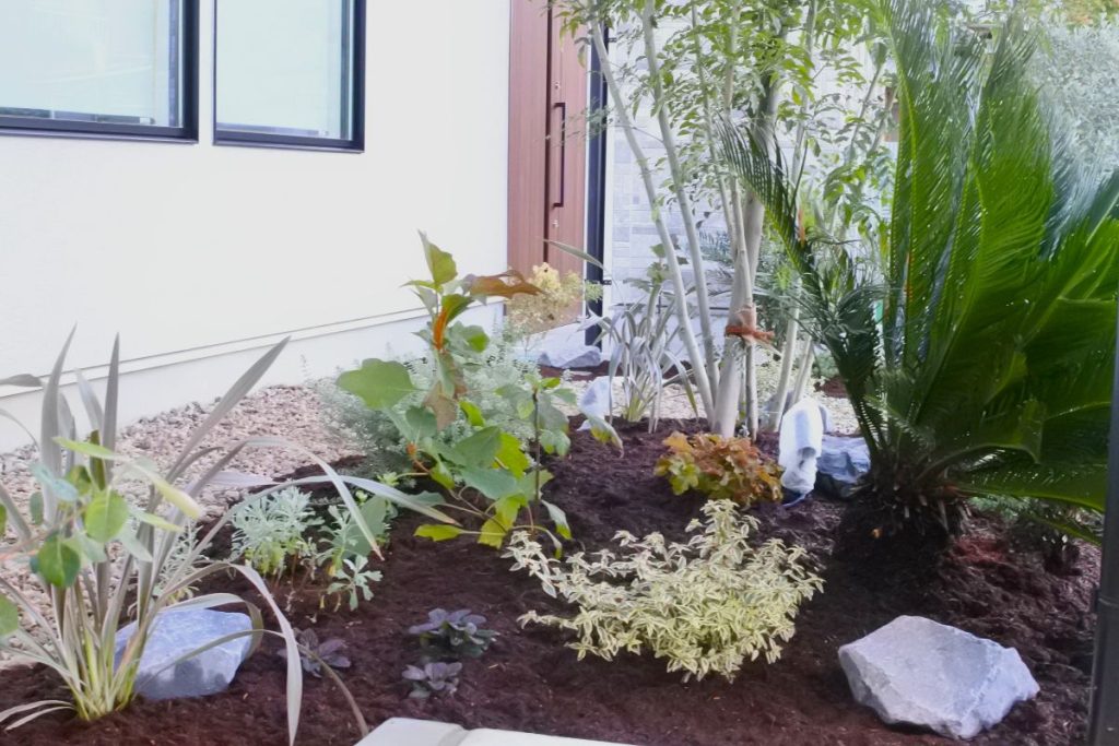 植栽も雑木風の植物にシルバーや南国風の植物を組み合わせた