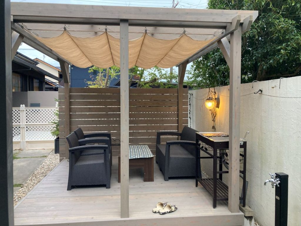 天然木のウッドデッキとパーゴラ、目隠しフェンスでお庭にリビングスペースを作りました。