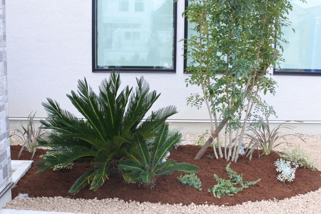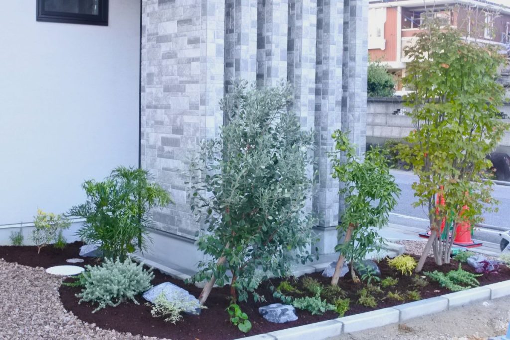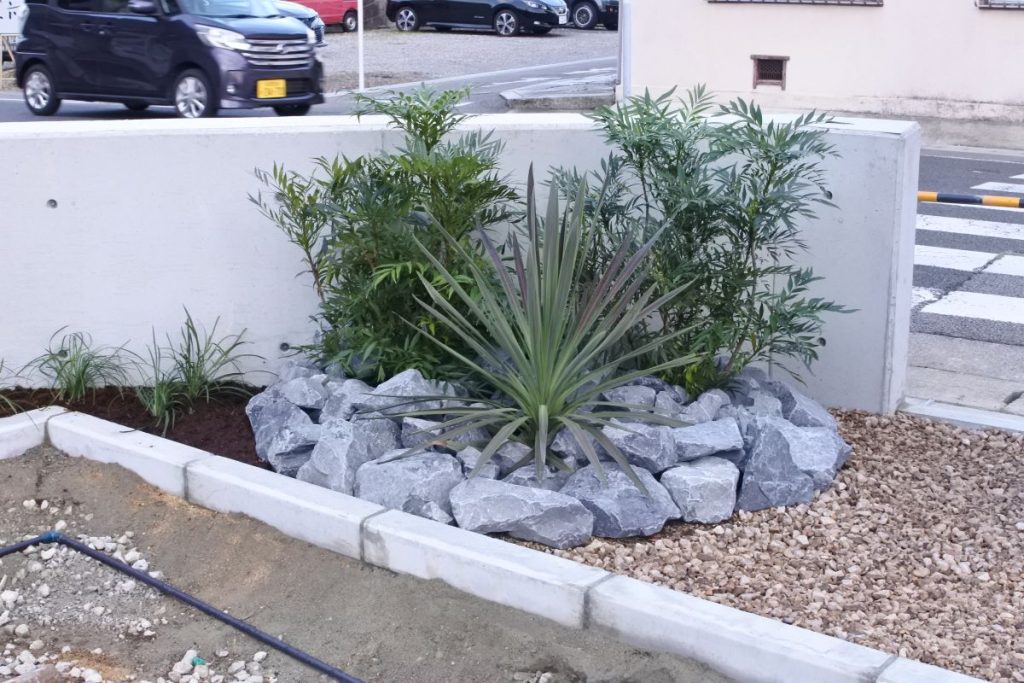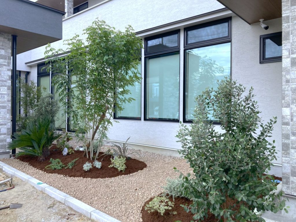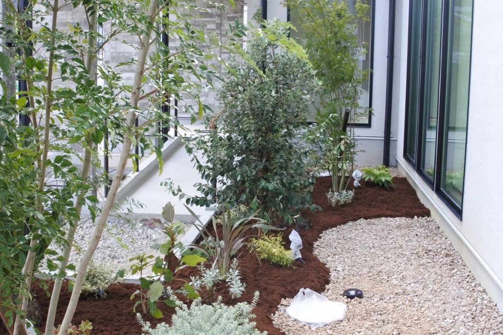 植栽帯には砂利敷や防草シート敷もデザインとして組み入れ、